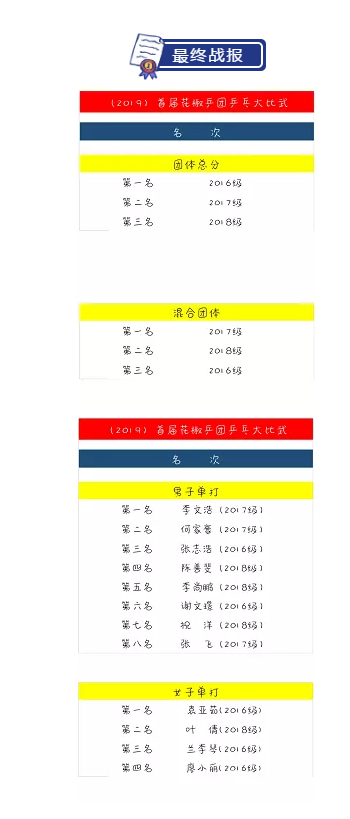 (2019)首届花椒乒团乒乓球大比武于6月24至6月25日在华东交大南区乒乓球馆正式举办。本次比赛:采用五局三胜制,每局11球,设三个比赛项目:分别是混合团体,男子单打,女子单打。