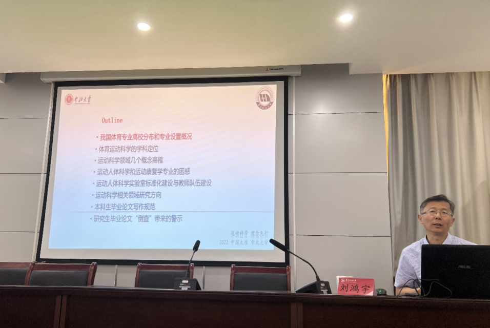 2023年5月26日下午,中北大学体育公司学术委员会主任刘鸿宇教授莅临公司,为公司师生做了一场主题为“体育学团队建设与硕士论文撰写”的学术报告。公司教师及研究生参与了在崇武楼101会议室举行的学术活动,报告会由公司副经理陈荣教授主持。